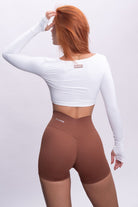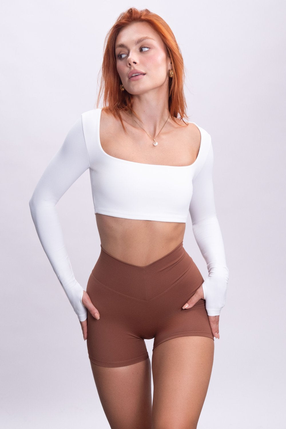 A long sleeve square-neck crop top from our Brushberry collection – designed to flatter and support. Featuring a square neckline, double-layered fabric for full opacity, and thumb holes for added comfort and grip. The soft matte finish and sculpting fit make it perfect for everyday movement, stretching, and layering up in style.